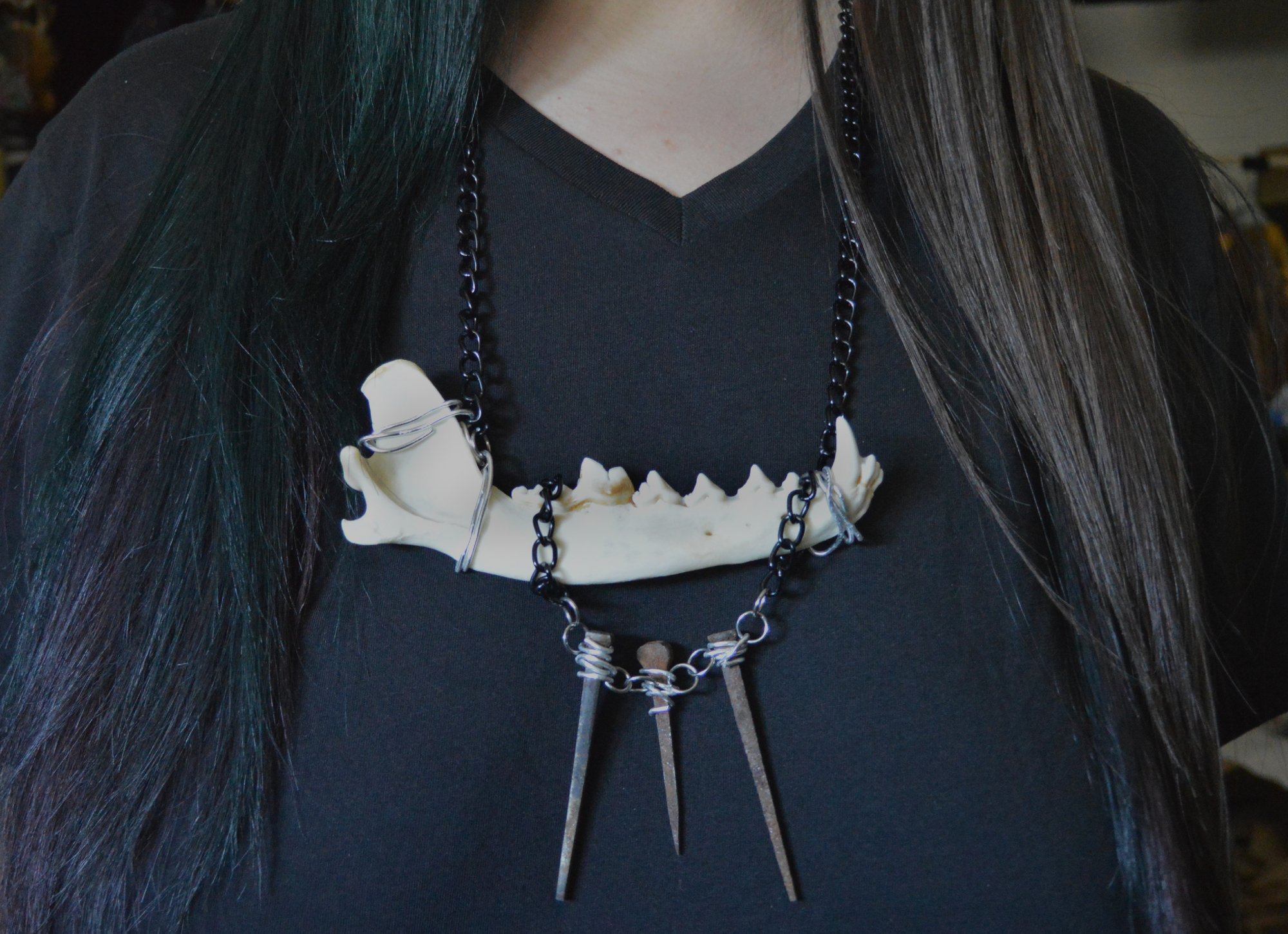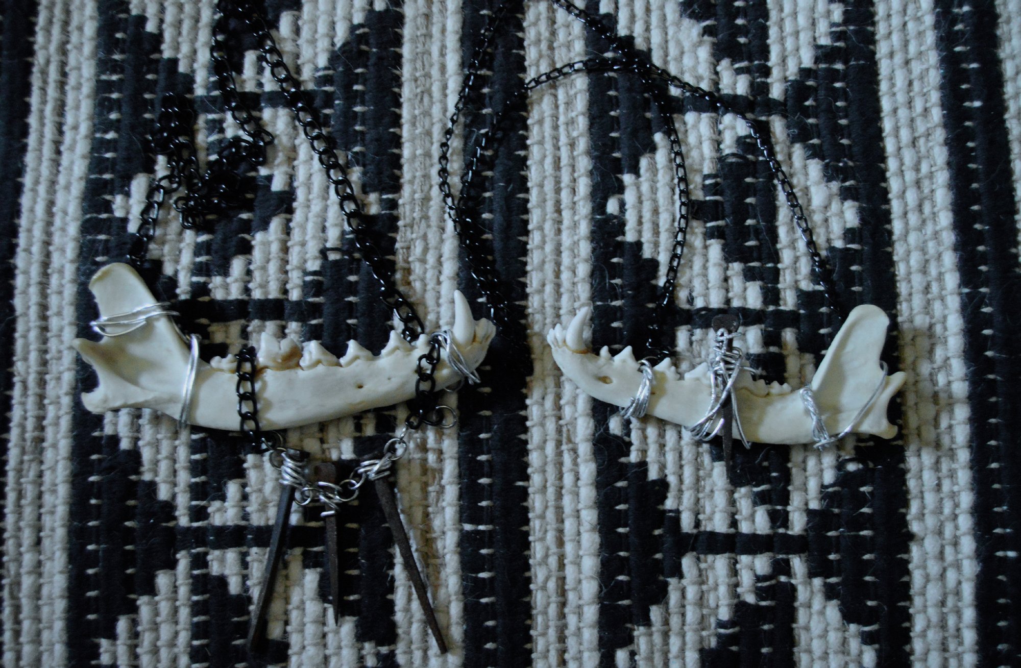 These are individual jawbone necklaces and not my typical bib style. One is slightly larger than the other, the one with the coffin nail chain is the larger one.